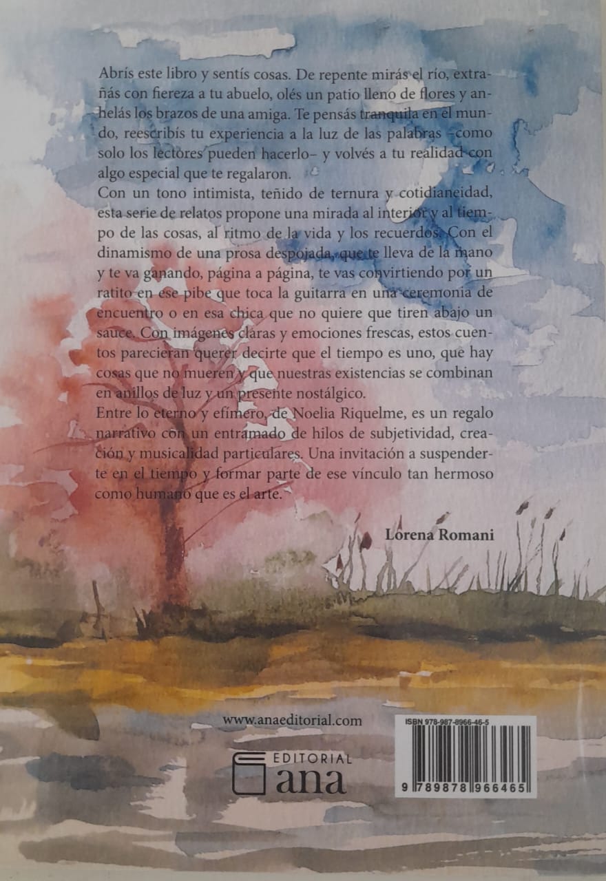 Entre lo eterno y efímero, de Noelia Riquelme, es un regalo narrativo con un entramado de hilos de subjetividad, creación y musicalidad particulares. Una invitación a suspenderte en el tiempo y formar parte de ese vínculo tan hermoso como humano que es el arte.