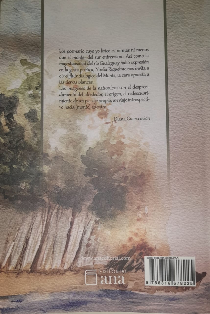 Un poemario cuyo yo lírico es ni más ni menos que el monte del sur entrerriano. Así como la majestuosidad del río Gualeguay halló expresión en la gesta poética, Noelia Riquelme nos invita a oír el fluir dialógico del Monte, la cara opuesta a las tierras blancas.