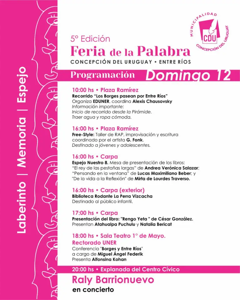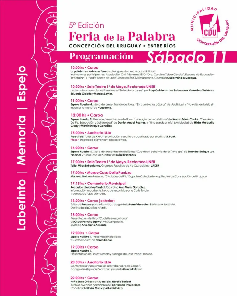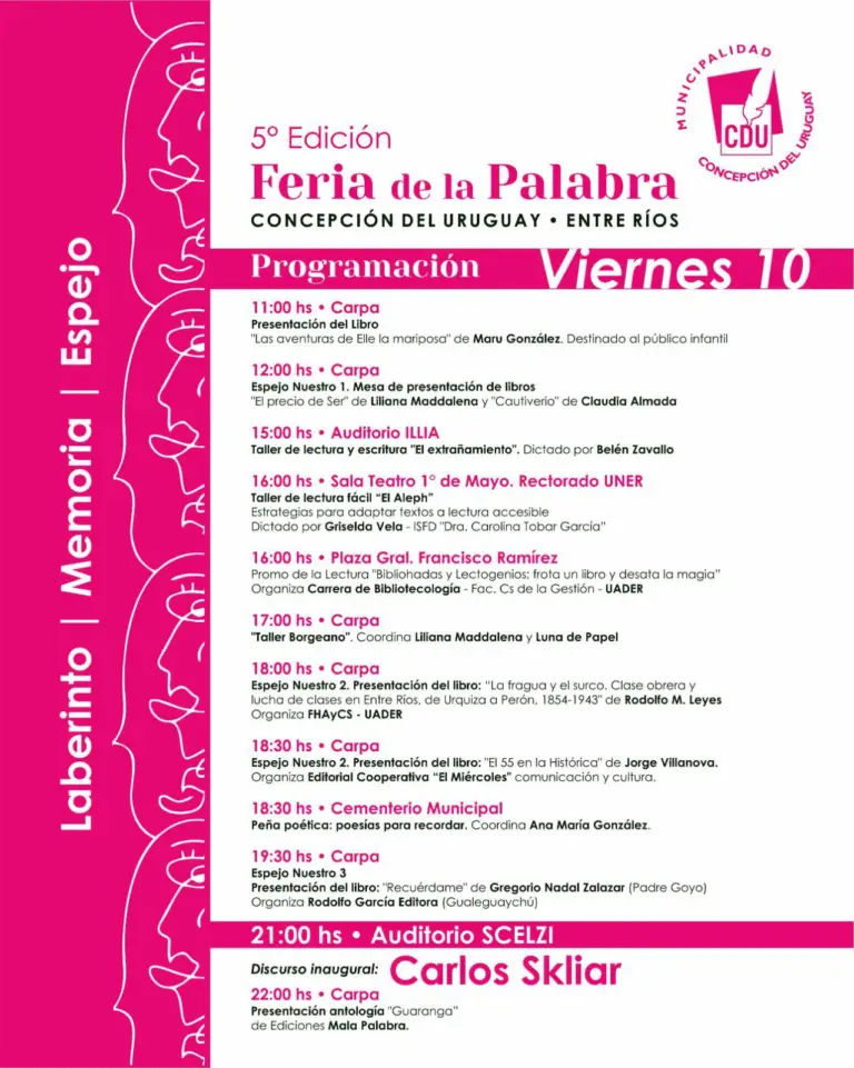 Bajo el lema “Laberinto. Memoria. Espejo”, inspirada en la obra de Jorge Luis Borges, la feria tendrá lugar en distintos espacios de la ciudad de Concepción del Uruguay, con más de 20 stands, conferencias, presentaciones de libros, y actividades pensadas para todos los públicos. Entre los invitados, se encuentran los escritores Carlos Skliar, Alejandro Vaccaro y Miguel Ángel Federik, quienes abordarán la figura de Borges y su relación con Entre Ríos.