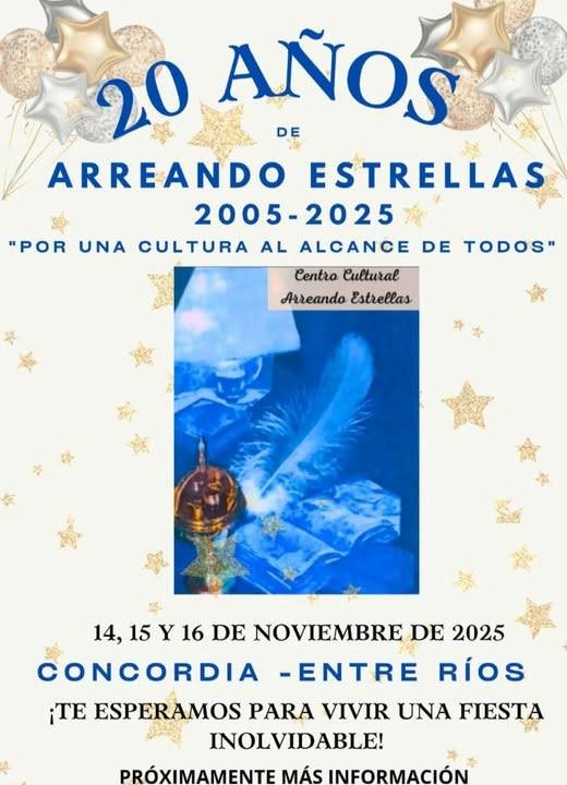 Programa tentativo 2025 – Ficha de inscripción – Hoteles sugeridos.El Centro Cultural Arreando Estrellas de Concordia Entre Ríos-Argentina los invita a participar del XIII Encuentro Latinoamericano de Poetas y Narradores en el marco de cumplir 20 años de trayectoria: “Por una cultura al alcance de todos”, a realizarse los días 14,15 y 16 de noviembre de 2025 en el Salón del Museo Provincial de la imagen sito en calle Buenos Aires n°179.