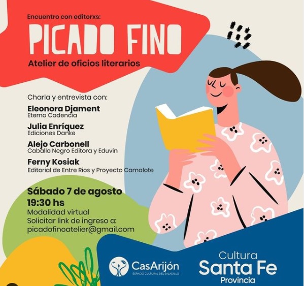 En el marco de PICADO FINO: Atelier de oficios literarios, que coordinan Maia Morosano, Rocío Muñoz Vergara y Cristian Wachi Molina en @casa_arijon, el espacio cultural de @santa_fe_cultura, quieren invitar a una nueva actividad con editores y editoras: Leonora Djament de Eterna Cadencia, Julia Enríquez de Ediciones Danke, Alejo Carbonell de Negro Editora y Eduvim, Ferny Kosiak de Editorial de Entre Ríos y Proyecto Camalote.